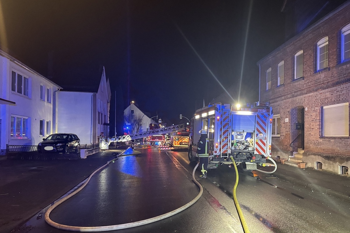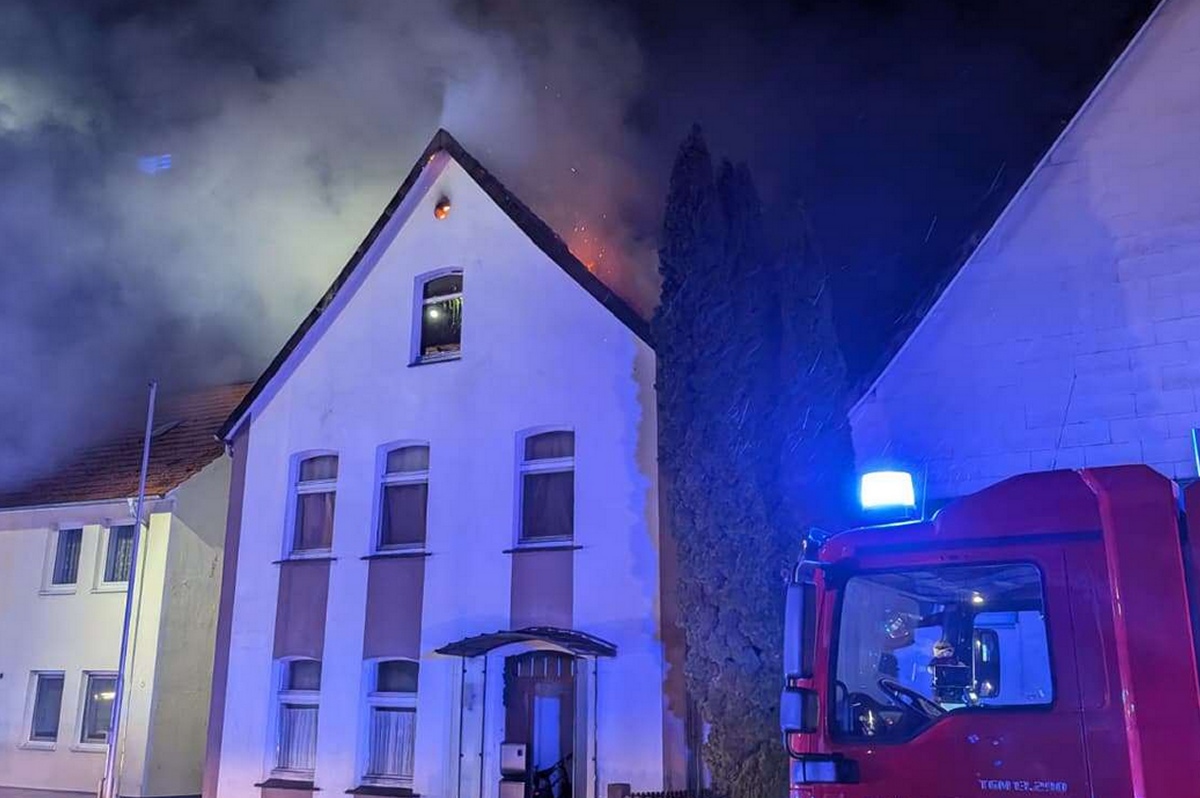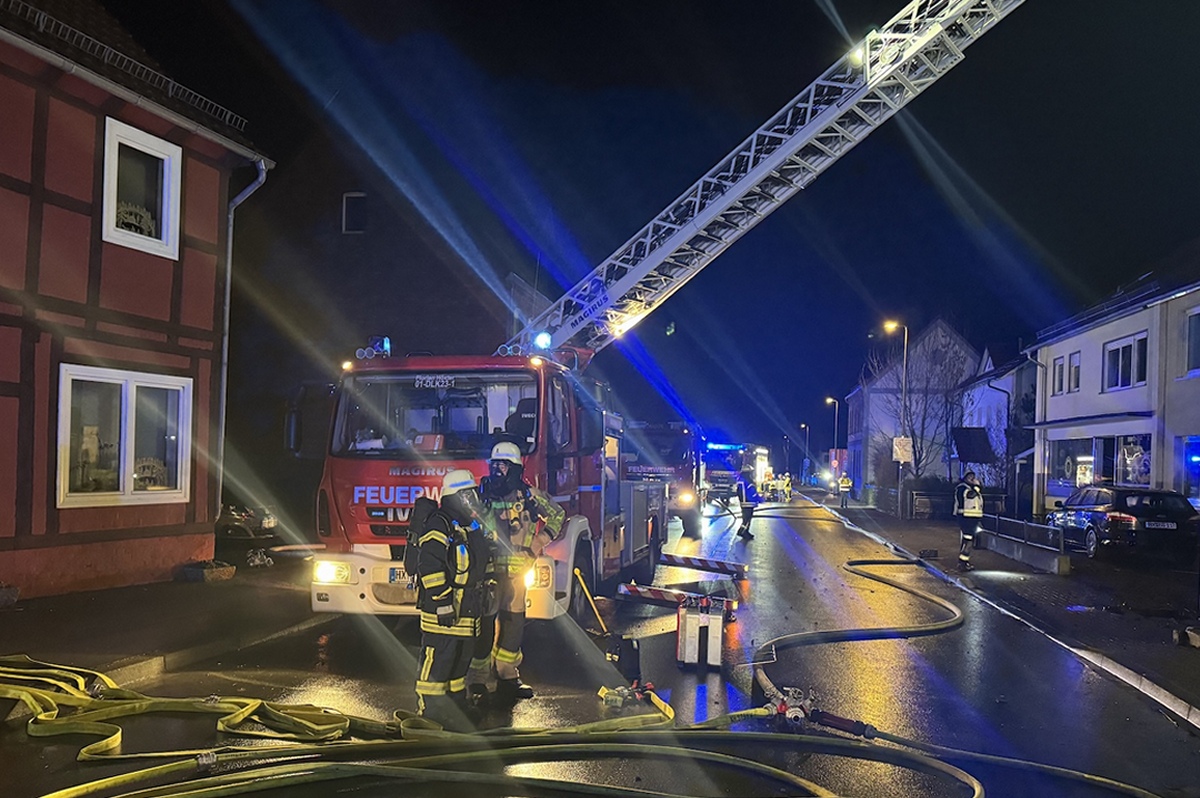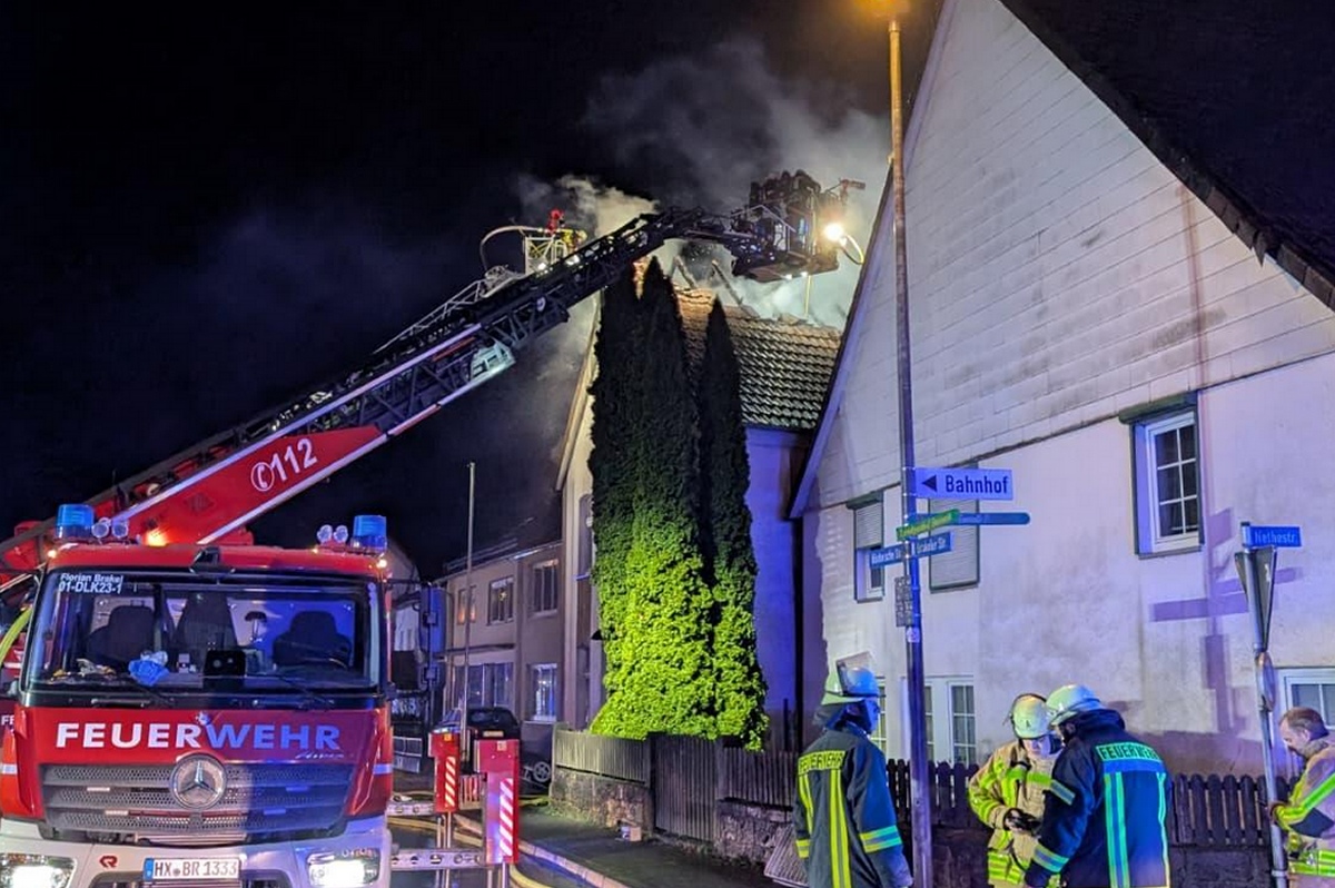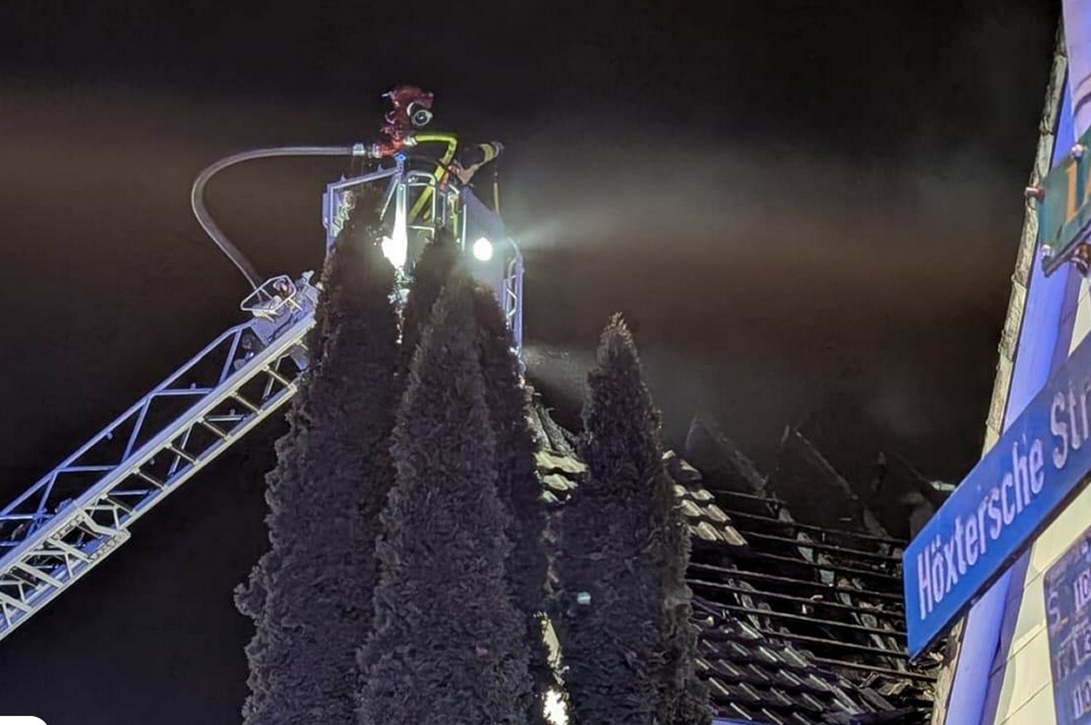 Ottbergen (TKu). Ein verherender Dachstuhlbrand hat in der Silvester- und Neujahrsnacht 2026 für einen Großeinsatz der Feuerwehr in Höxter-Ottbergen gesorgt. Gegen 0.15 Uhr wurden die Einsatzkräfte zu einem Wohnhaus an der Höxterschen Straße, Ecke Nethestraße, alarmiert. Beim Eintreffen der ersten Feuerwehrkräfte stand der Dachstuhl des Einfamilienhauses bereits in Vollbrand. Feuer schlug durch die Dachhaut und die gesamte Straße war stark verraucht, wie Zeugen berichten. Der Dachstuhl brannte vollständig aus. Nach Angaben der Polizei handelte es sich um den größten Brand im Kreis Höxter in dieser Neujahrsnacht neben zahlreichen kleineren Hecken- oder Mülltonnenbränden. Dank des schnellen und professionellen Eingreifens der Feuerwehr konnte ein Übergreifen der Flammen auf zwei unmittelbar benachbarte Häuser verhindert werden. Verletzt wurde durch den Großbrand niemand, die Bewohner des Hauses konnten das Gebäude noch rechtzeitig verlassen.