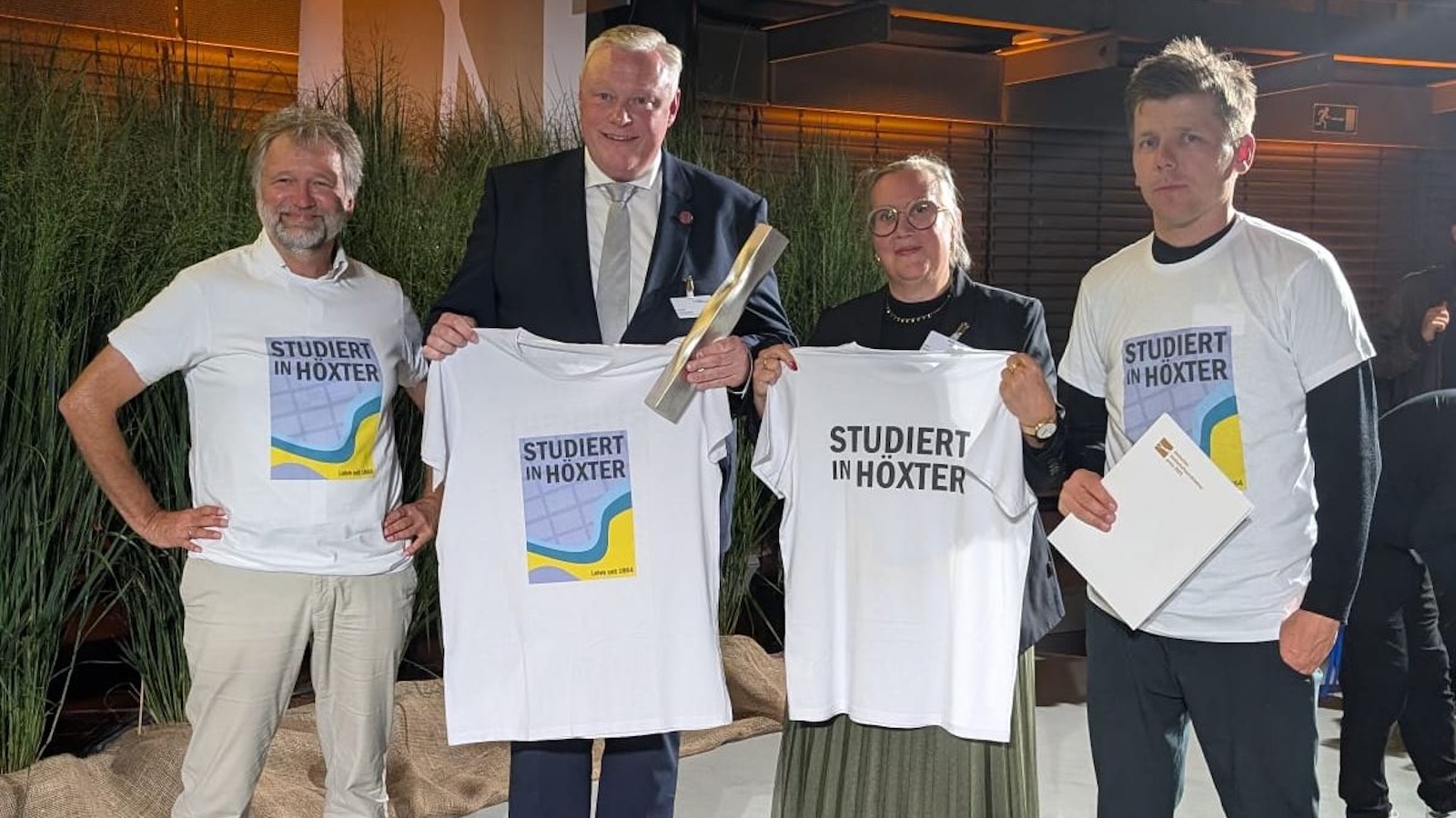 Im Rahmen der Preisverleihung präsentierten die Teilnehmer ein T-Shirt mit dem Schriftzug "Studiert in Höxter". Bürgermeister Hartmann betonte, dass der Slogan als deutschlandweite Qualitätsmarke zu sehen sei. Bereits seit 1864 würden an der Hochschule in Höxter tausende Ingenieure, heute Bachelor und Master in den Bereichen Bauingenieurwesen, Architektur, Umweltingenieurwesen, Landschaftsarchitektur und Umweltplanung ausgebildet. Absolventinnen und Absolventen aus Höxter genießen deutschlandweit einen exzellenten Ruf. Bernd Schackers hob hervor, dass sein Planungsbüro in Höxter allein 11 Mitarbeitende aus den Fachbereichen Landschaftsarchitektur, Umweltplanung und Umweltingenieurwesen beschäftigt - ein Beleg für die hohe Qualität, Praxisnähe und gute Zusammenarbeit bei der Ausbildung in Höxter.