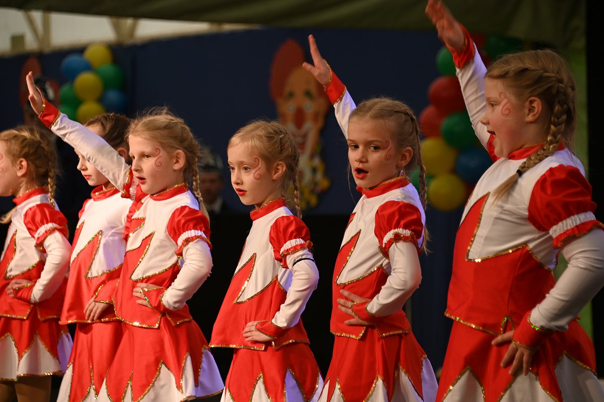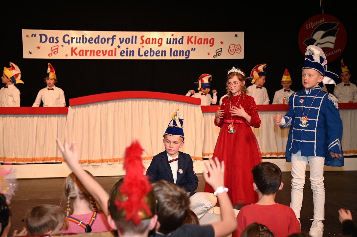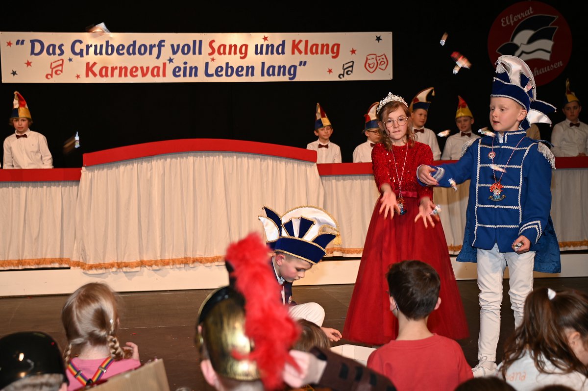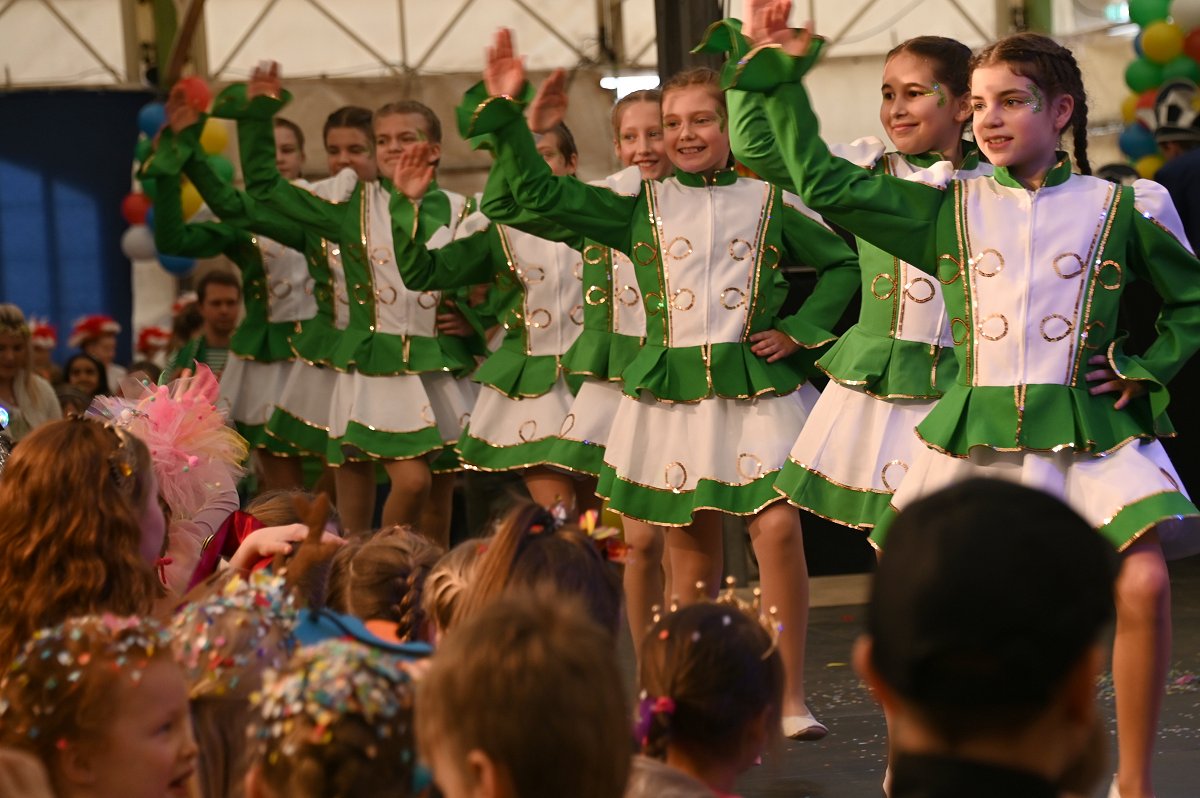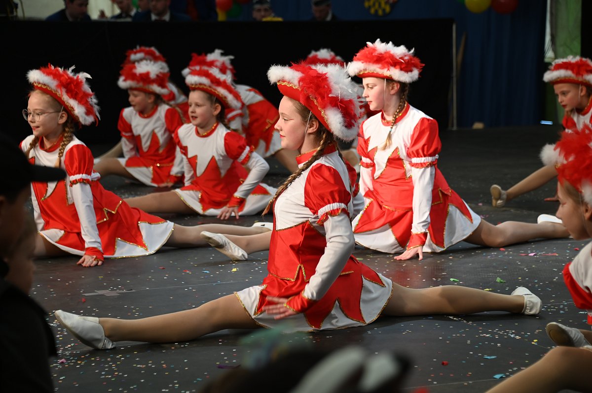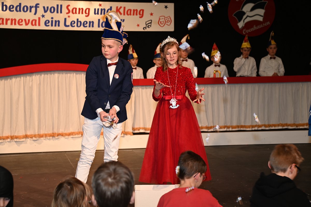 Durch das Programm führte Kinderpräsident Henri Schmidt, der souverän und gut gelaunt durch den Nachmittag leitete. Begleitet wurde er vom amtierenden Kinderprinzenpaar Prinz Linus der Fußballbegeisterte (Gorzolka) und Prinzessin Mathilda die Magische (Jordan). Nach ihren Grußworten dankte das Publikum dem Prinzenpaar mit kräftigem Applaus für den schwungvollen Ehrentanz. Im weiteren Verlauf präsentierten zahlreiche Gruppen ihr Können auf der Bühne. Tänze wie die Karnevalsmaus, ein orientalischer Tanz, mehrere Gardetänze, ein „Olaf-der-Schneemann-Tanz“, ein Hip-Hop-Tanz sowie weitere Darbietungen sorgten für Abwechslung und Begeisterung. Mitwirkende waren unter anderem die Kinderprinzengarde, der Kindergarten Ovenhausen, der Petri-Ganztag, die Fünkchen und Funken Ossendorf, die Eltern-Kind-Turngruppe, die Kindergarde Ottbergen, die Tanzmäuse Erkeln sowie die Ehren- und die Teeniegarde. Ein süßer Höhepunkt bildete den Abschluss des Nachmittags: Bonbons für alle Kinder, die vom Kinderprinzenpaar gemeinsam mit dem Kinderpräsidenten in die jubelnde Menge geworfen wurden.
