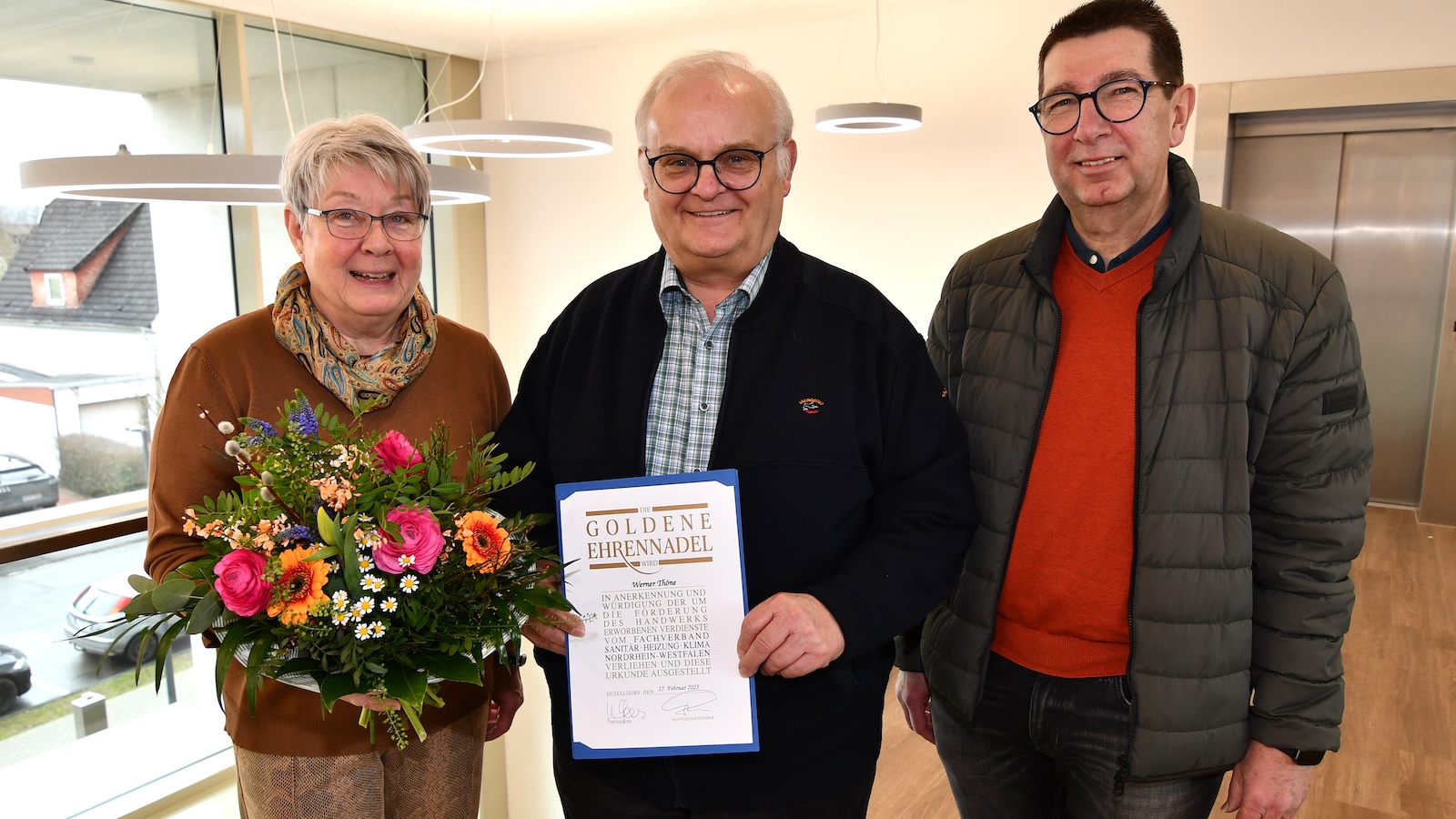 Jutta Wiegand (Obermeisterin der Innung für Sanitär-, Heizungs- und Klimatechnik Höxter-Warburg) und Berthold Atteln (stv. Obermeister) überreichen Werner Thöne die „Goldene Ehrennadel“.